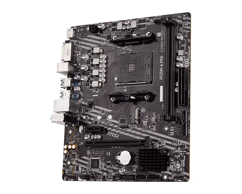 Motherboard MSI A520M-A PRO, Socket AM4, MicroATX, Soporta Procesadores Ryzen 5000 y 3000 y 4000G series, 64 GB DDR4 SDRAM Ram Máxima Soportada(Requiere BIOS basada en ComboPI 1.0.0.3 y superior), Velocidad de Memoria Soportada: 1866Mhz hasta 4600Mhz, UDIMM, 2 Puertos de Memoria RAM, 1 Puerto de Mouse, 1 Puerto de Teclado, Cuenta con 1 Puerto HDMI y 1 Puerto DVI-D, 4 Puertos USB 3.2 Gen 1, 2 Puertos USB 2.0, Cuenta con 4 Interfaces SATA, 1 Puerto M.2.